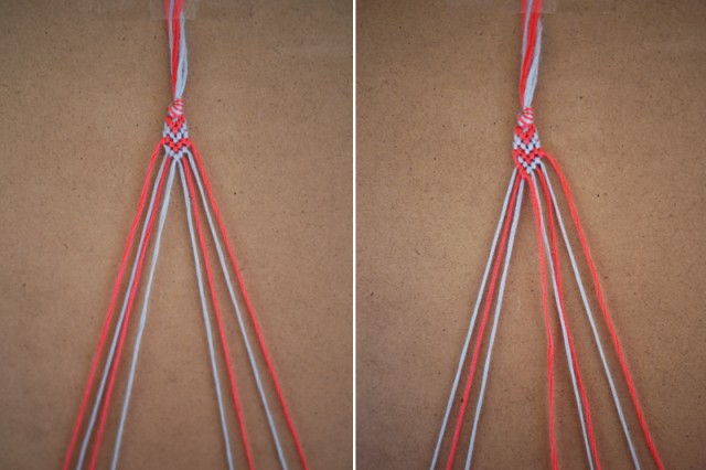 Pull up and to the right to tighten. Make the same knot twice everytime.Continue knotting over each color, towards the right, until the outermost color has carried over to the middle. This is one half of the chevron pattern.